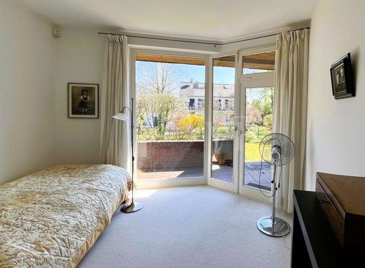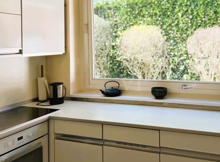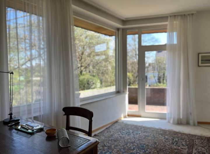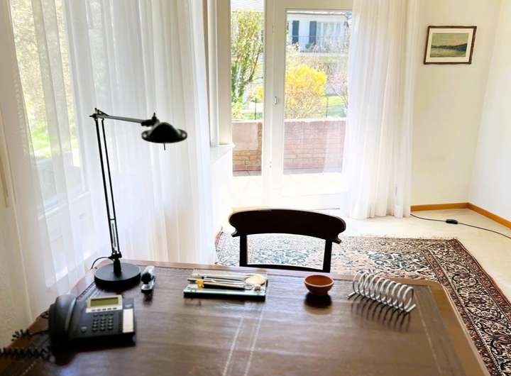 Wohn- und Essbereiche gehen nahtlos ineinander über und bieten einen herrlichen Ausblick in den parkartig angelegten Garten – ein kleines Paradies für Familien. Die großzügige Terrasse lädt dazu ein, die Sonne zu genießen. Der Balkon vor den Schlafzimmern liegt wie ein Logenplatz über dem Garten und bildet einen entspannten Rückzugsort. Sowohl Sonne als auch lichten Schatten bietet ein Freisitz unter einem Obstbaum im Rasen!