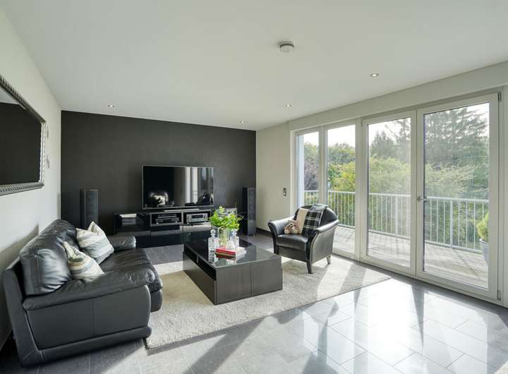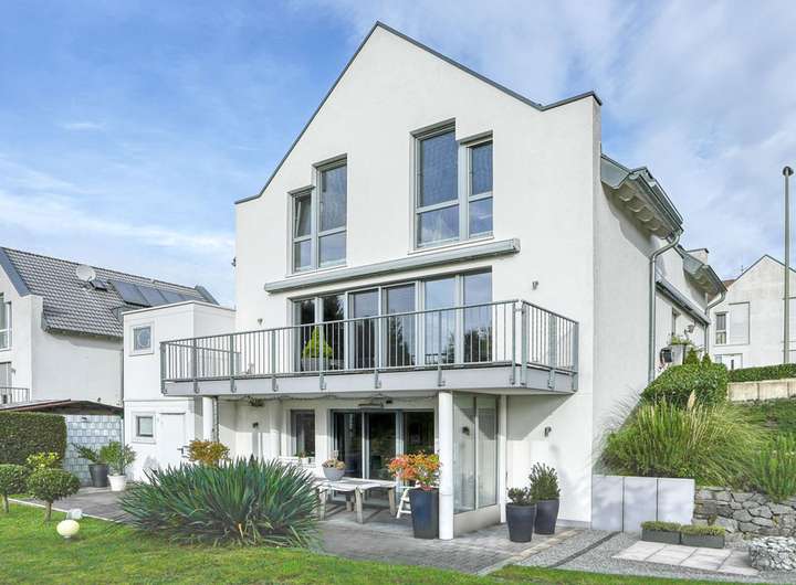 Im Erdgeschoss befinden sich, ausgehend von der Diele mit Garderobe und Gäste-WC, der großzügig geschnittene Wohn-/Essbereich mit Zugang auf einen großen, sonnigen Balkon sowie die hochwertig ausgestattete Küche mit Essplatz und mit Zugang auf die Terrasse und in den Garten.