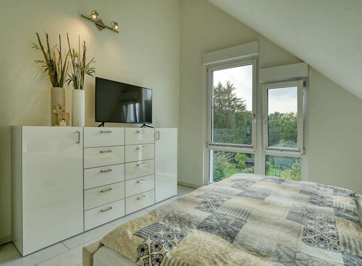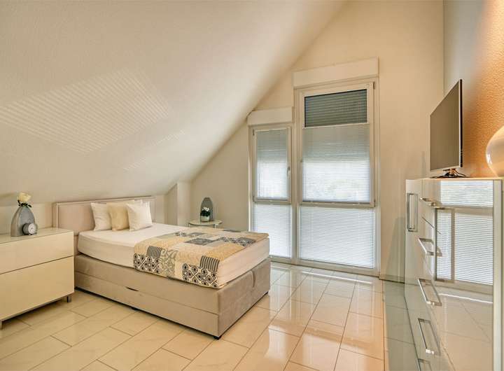 Im Dachgeschoss liegen vier ähnlich große Räume, die sich als Schlaf-, Kinder- oder Arbeitszimmer eignen. Das gut belichtete Badezimmer ist mit einer bodengleichen Dusche ausgestattet.