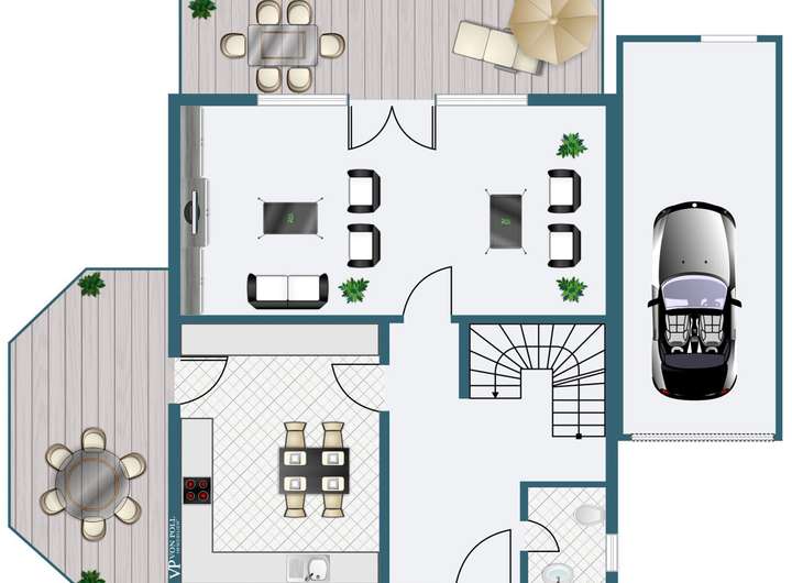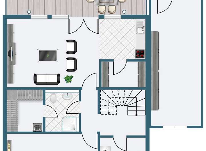 - Terrasse im Gartengeschoss teilweise überdacht