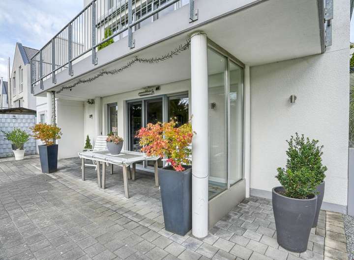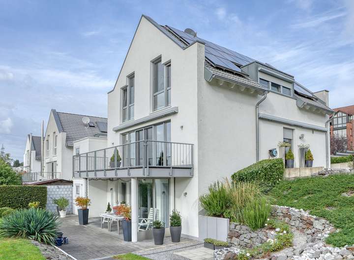 Der terrassierte und schön gestaltete Garten ist nach Süden ausgerichtet. Die Terras-sen und der Balkon sind mit einer Beschattungsmöglichkeit ausgestattet.