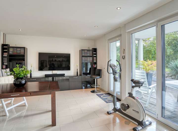 Im Gartengeschoss befinden sich ein großer, vielseitig nutzbarer Raum mit Zugang auf eine teilüberdachte Terrasse und in den Garten, ein Duschbad mit Sauna, außerdem ein Raum, der sich als Arbeitszimmer eignet, ein Abstellraum und ein Hauswirt-schafts- und Haustechnikraum. Der Abstellraum unter der Garage ist von der Terrasse zugänglich.