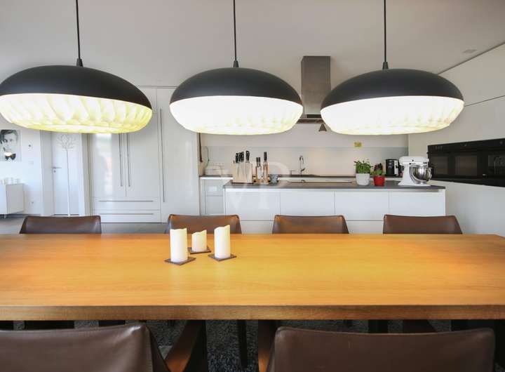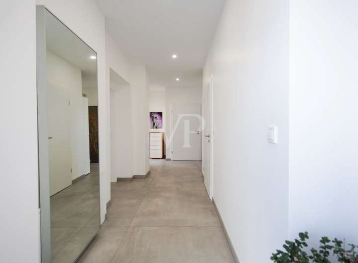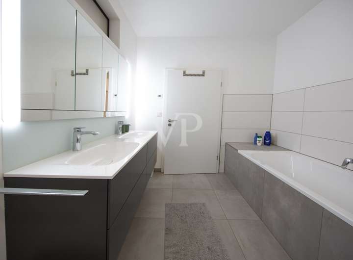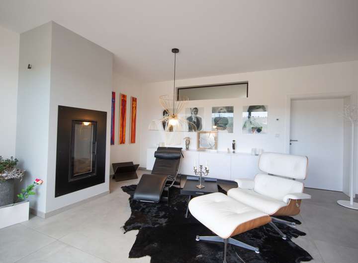 Im gesamten Haus wurden ausschließlich hochwertige Materialien verwendet und besondere Details geschickt in Szene gesetzt. Großflächige Fliesen im Format 1,20 m x 1,20 m sorgen – außer in den Schlafräumen – für ein elegantes Wohngefühl. Das ausgeklügelte Lichtkonzept setzt weitere Akzente.