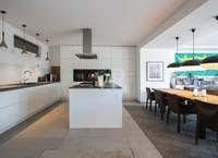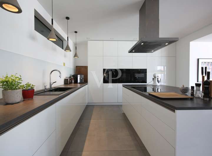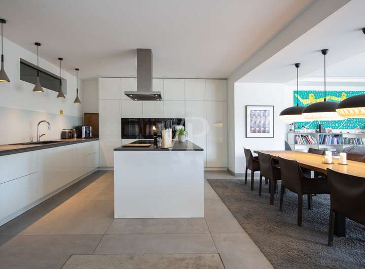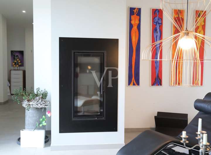 Über die Eingangstür betritt man einen großen Loungebereich, der sich nahtlos an den offenen Küchen-, Ess- und Wohnbereich anschließt. An kühlen Abenden sorgt ein Kamin für wohlige Wärme und gemütliche Stunden. Die moderne Küche mit Kochinsel, zahlreichen Einbauschränken und hochwertigen Geräten lässt keine Wünsche offen. Der angrenzende Essbereich geht in das helle Wohnzimmer über, von dem aus man einen wunderbaren Blick in den Garten mit Pool hat und direkten Zugang zur Terrasse erhält.
