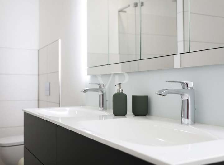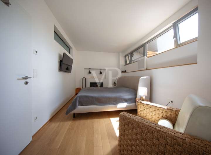 Das Hauptschlafzimmer verfügt über ein großzügiges Ankleidezimmer mit direktem Zugang zum stilvollen Masterbad, das mit Dusche und Wanne ausgestattet ist. Insgesamt gibt es zwei weitere Zimmer sowie einen Hauswirtschaftsraum. Beide Bäder bestechen durch ihre hochwertige Ausstattung und modernes Design mit Blick auf die Weinberge und das Spitzhaus.