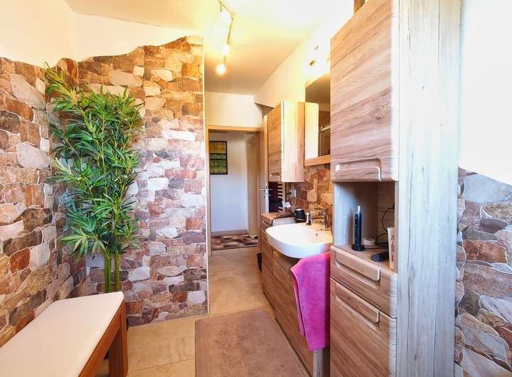 Im Erdgeschoss erreicht man durch das großzügige Treppenhaus die Einliegerwohnung. Diese besteht aus 3 Schlafzimmern, einem Wohnbereich mit Kaminofen und Ausgang zur Südterrasse/Garten, einer abgetrennter Küche mit Essbereich, Badezimmer und einem Gäste-WC.