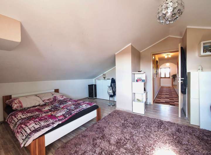 Von der Wohnung im 1. Obergeschoss gelangt man über eine innenliegende Treppe in das ausgebaute Dachgeschoss welches eine Wohnfläche von ca. 80 m² beinhaltet. Hier befinden sich 3 weitere Schlafzimmer, ein begehbarer Kleiderschrank, ein Bad sowie ein Abstellraum.