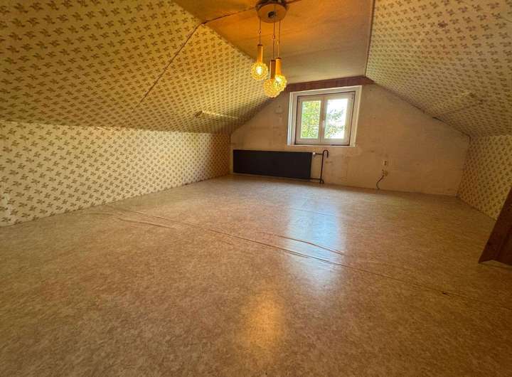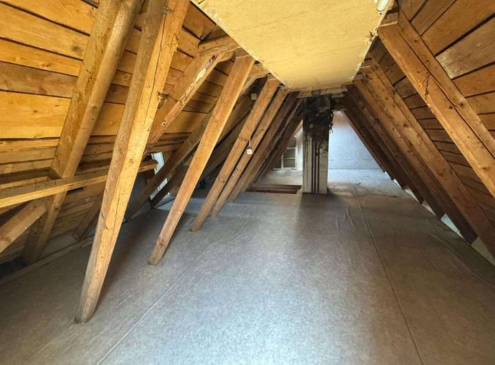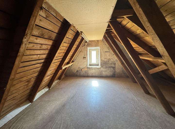 Der Zugang zu einem darüberliegenden Raum, der sich gut als Kinderzimmer eignen würde, ist aktuell nur über den Dachboden möglich. Durch den Einbau einer Treppe könnte dieser Raum aber direkt erschlossen werden. Der Dachboden dient aktuell als Trockenraum und Lagerfläche.