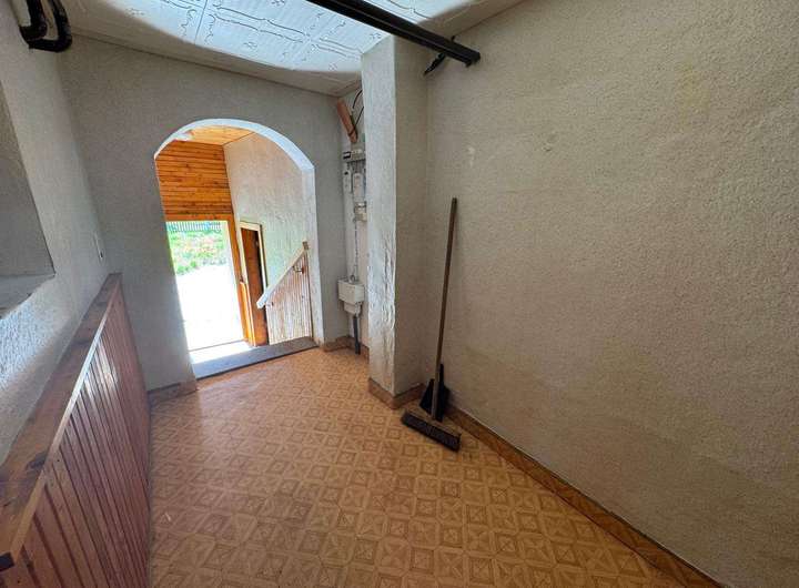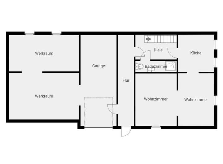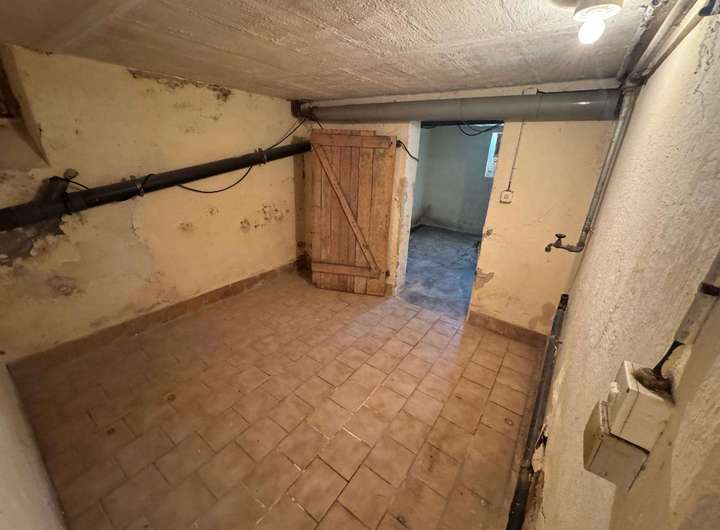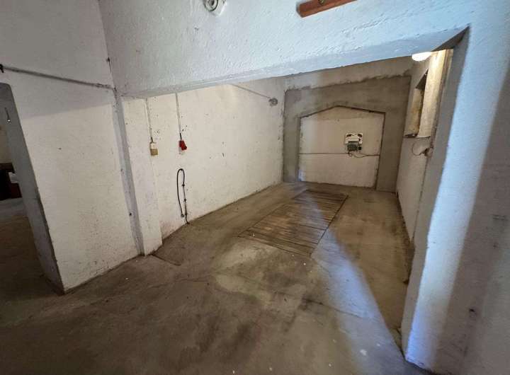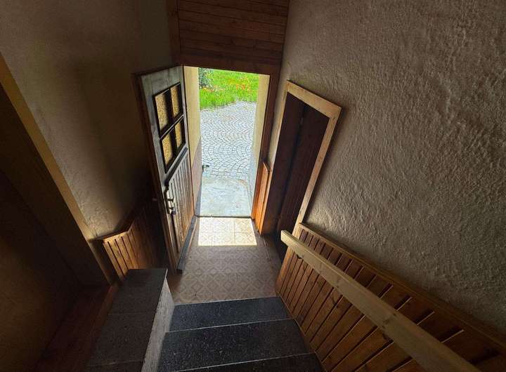 Über wenige Stufen gelangt man vom Eingangsbereich ins Erdgeschoss. Der Flur bietet Zugang zum Wohnbereich sowie zum Keller. Der Keller umfasst drei Lagerräume, den Hauswasseranschluss (bereits modernisiert) sowie einen ehemaligen Heizungsraum mit einer wahrscheinlich nicht mehr zulässigen Festbrennstoffheizung.