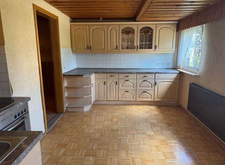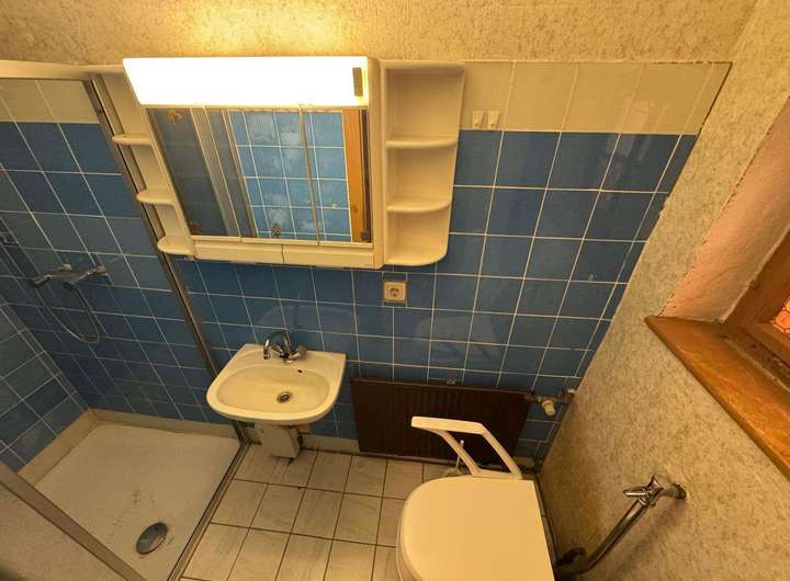 Im Erdgeschoss befinden sich außerdem eine Küche, ein großzügiger Wohnbereich und ein kleines Badezimmer mit Dusche, WC und Waschtisch. Die Ausstattung entspricht nicht mehr dem heutigen Standard, ist jedoch grundsätzlich nutzbar.