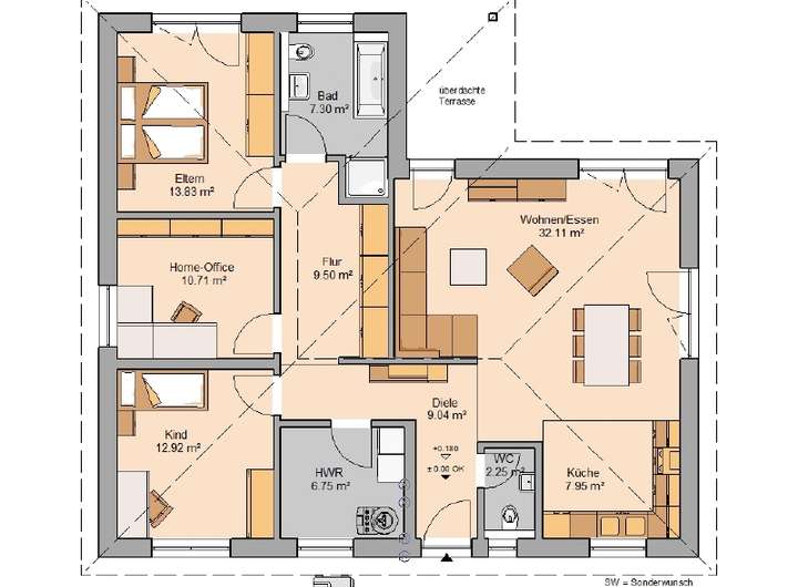 Das Familienhaus Enea überzeugt als ebenerdiger Wohntraum mit einem offenen Wohn-/Essbereich mit angrenzender Küche. Hier kann das Leben statt finden. Außerdem bietet das Haus ein Elternschlafzimmer, ein Kinderzimmer und ein Home-Office. Genug Räume um Rückzugsmöglichkeiten zu schaffen. Abgerundet wird der eingeschossige Grundriss durch ein Familienbad, ein Gäste-WC und dem Hauswirtschaftsraum.