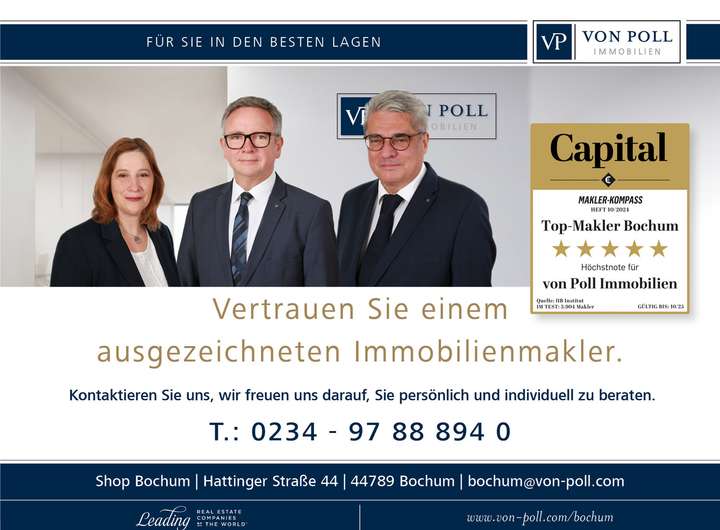Dieses Baugrundstück liegt in einer ruhigen Nebenstraße in einer sehr bevorzugten Lage im Bochumer Süden, in Bochum-Wiemelhausen, unmittelbar angrenzend an Stiepel und Weitmar-Mark. Diese Gegend gehört zu den begehrtesten Wohngebieten des östlichen Ruhrgebietes und ist geprägt durch ausgedehnte Grünflächen, die Nähe zur Ruhr und zum Ruhr-Stausee einerseits und seine ausgezeichnete Infrastruktur andererseits. Versorgungseinrichtungen des täglichen Bedarfs finden sich im Ortskern von Weitmar-Mark, die Bochumer Innenstadt mit ihren vielfältigen Einkaufsmöglichkeiten ist sehr gut erreichbar, sowohl mit dem PKW, als auch mit öffentlichen Verkehrsmitteln. Mehrere Schulen und Kindergärten sowie die Ruhr-Universität und andere Hochschulen liegen in geringer Entfernung.