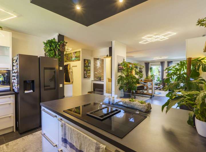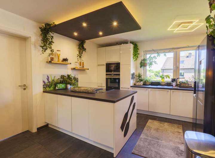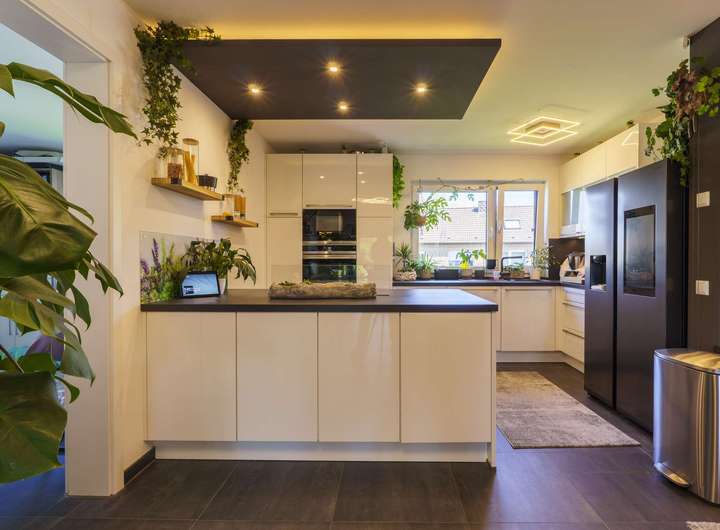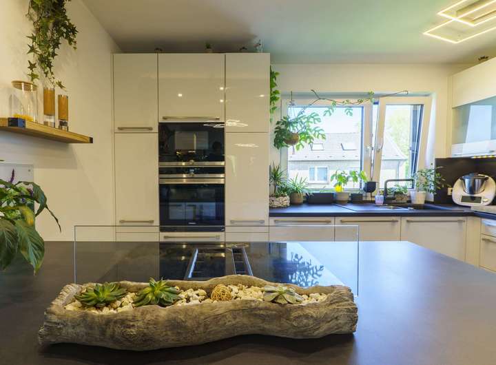 Der offen gestaltete Wohn-, Ess- und Kochbereich ist das Herzstück der Wohnung. Große Fensterfronten lassen viel Tageslicht herein und schaffen eine freundliche Atmosphäre. Der Übergang von der Küche in den Wohnbereich wirkt großzügig und trotzdem klar gegliedert. Von hier aus gelangt man direkt auf die sonnige Dachterrasse mit Blick auf die angrenzenden Gärten. Auch das Schlafzimmer bietet Zugang zu dieser Terrasse. Die hochwertige Einbauküche mit Kochinsel kann gegen Aufpreis übernommen werden.