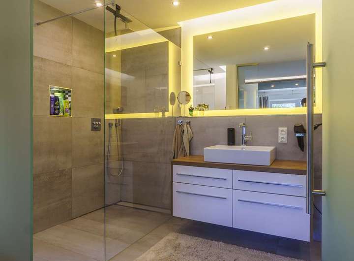– Fußbodenheizung in allen Räumen, betrieben durch Wärmepumpe