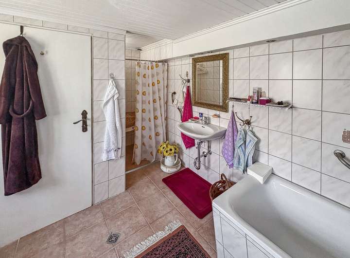 Im Obergeschoss befinden sich drei geräumige Schlafzimmer, die durch ihre durchdachte Aufteilung und Helligkeit überzeugen. Zwei Badezimmer, eines davon mit Badewanne und Dusche, sorgen für zusätzlichen Komfort.
