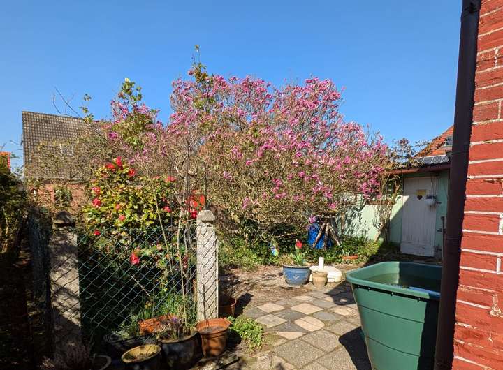 Der Hauptteil des Grundstücks liegt idyllisch hinter dem Deich und verfügt über einen direkten Zugang zur Oste – ein echtes Highlight für Naturliebhaber, Paddler oder alle, die gern am Wasser wohnen. Direkt am Haus selbst befinden sich eine kleine Terrasse und ein Gartenhaus.