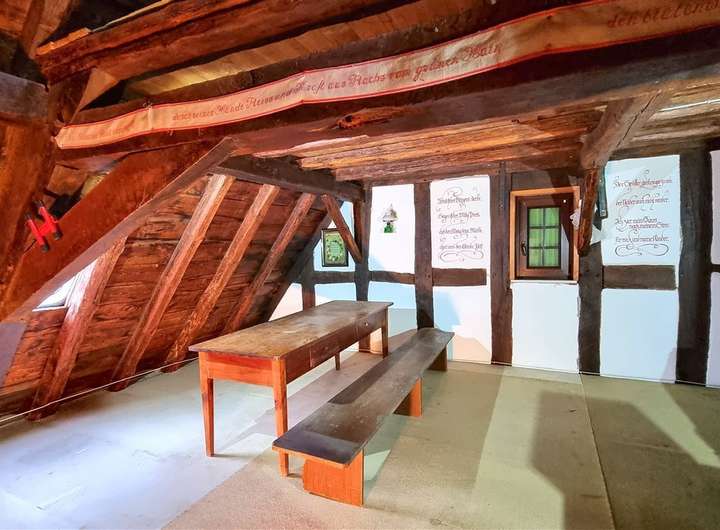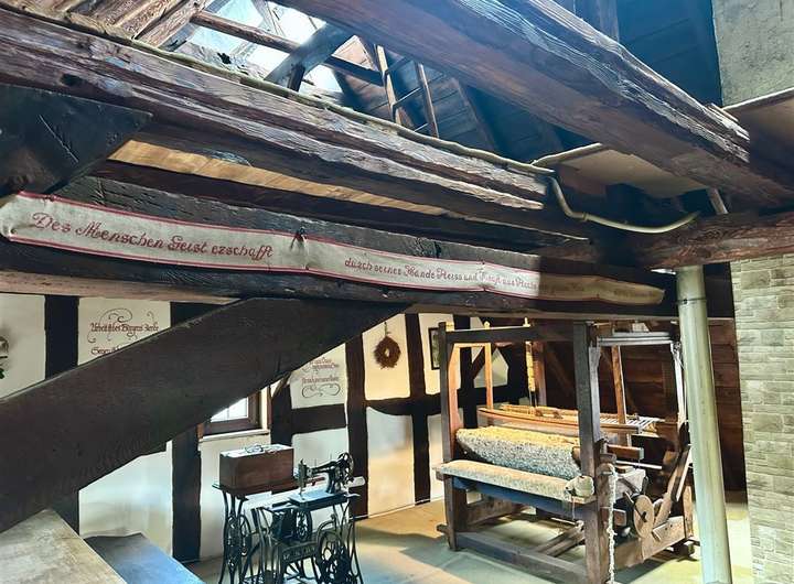 Viele historische Details, darunter ein originaler Webstuhl im Dachgeschoss und landwirtschaftliche Geräte aus dem frühen 20. Jahrhundert sind noch vorhanden und können übernommen werden.