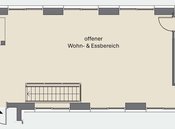 Bereits beim Betreten der Wohnung fällt der offene Grundriss ins Auge: Ein weitläufiger, heller Wohnbereich mit bodentiefen Fenstern bietet Raum für Wohnen, Kochen und Essen in besonderer Atmosphäre. Die Einbauküche mit allen Elektrogroßgeräten ist dezent integriert. Ebenfalls im Erdgeschoss befinden sich ein Gäste-WC sowie ein weiteres Zimmer, das ideal als Arbeits- oder Gästezimmer genutzt werden kann.