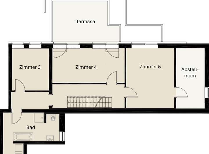 Im Souterrain bietet die Wohnung drei weitere Zimmer sowie ein modernes Badezimmer mit Wanne, Dusche, Fenster und Anschlüssen für Waschmaschine und Trockner. Ein praktischer Kellerraum ist direkt von der Wohnung aus zugänglich. Von einem der Zimmer gelangt man auf die Terrasse und in den schönen und großzügigen Gemeinschaftsgarten – eine grüne Oase mitten in der Stadt.