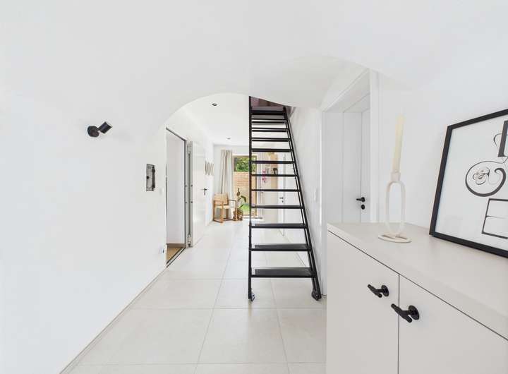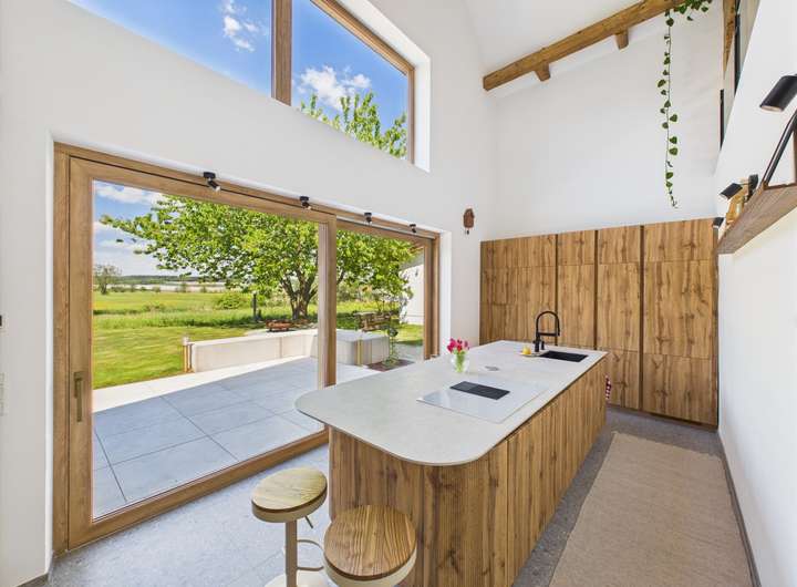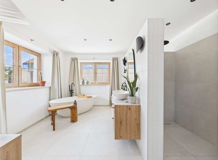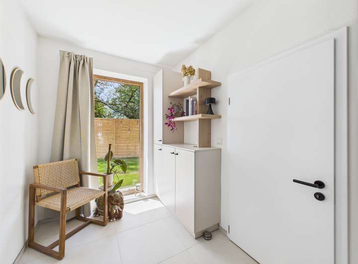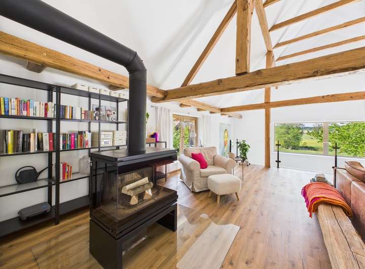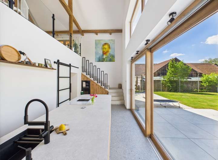 Auf ca. 265 m² Wohnfläche verteilen sich sechs großzügige Zimmer, darunter drei Schlafzimmer, eine offene Wohngalerie mit hoher Decke, ein stilvolles Bad sowie ein lichtdurchfluteter Wohn- und Essbereich mit traumhaftem Blick ins Grüne. Die maßgefertigte Designerküche, warme Naturmaterialien wie Naturstein, edles Parkett und zwei Kaminöfen verleihen dem Haus eine besondere Atmosphäre. Maßgeschneiderte Einbauschränke und eine elegante Einbauankleide runden das Wohnkonzept ab.