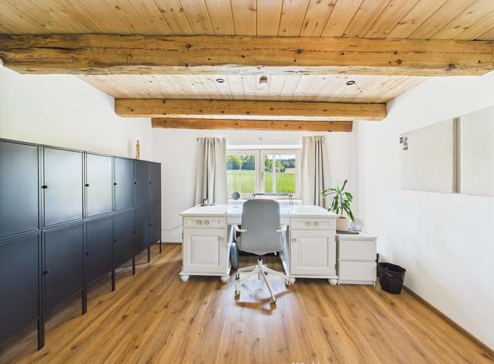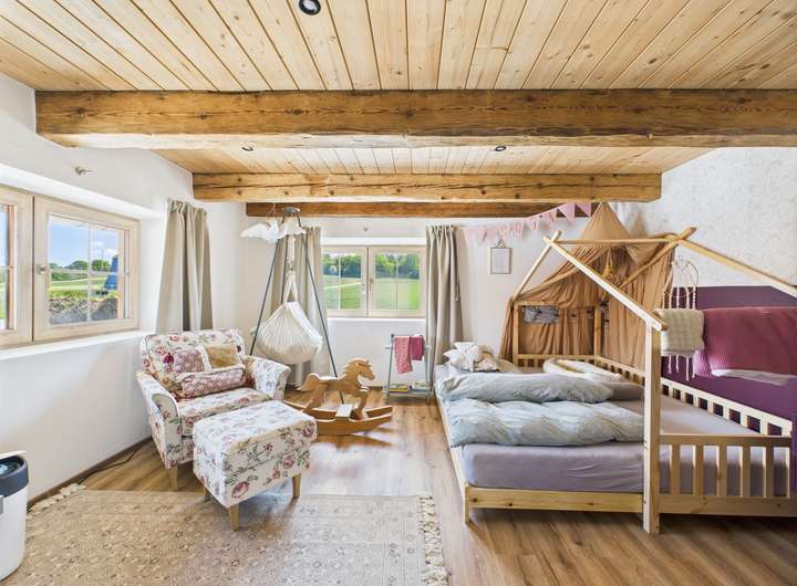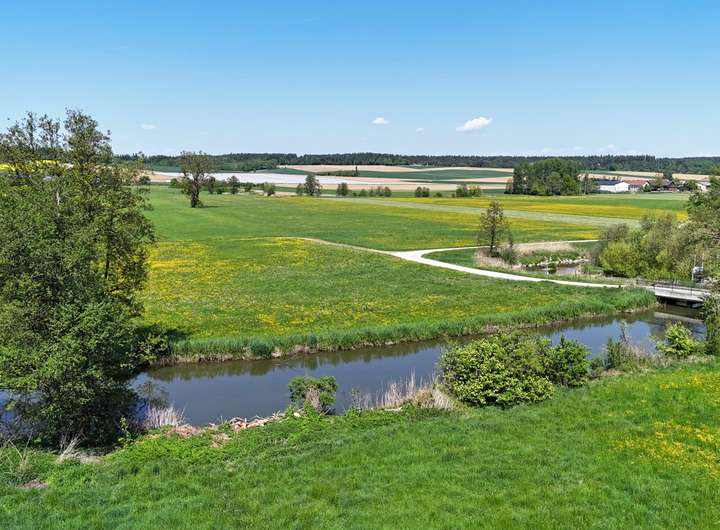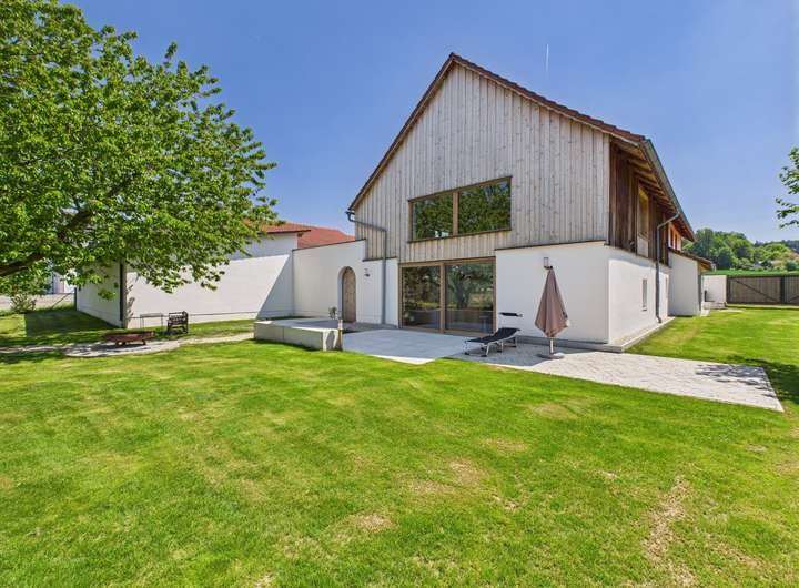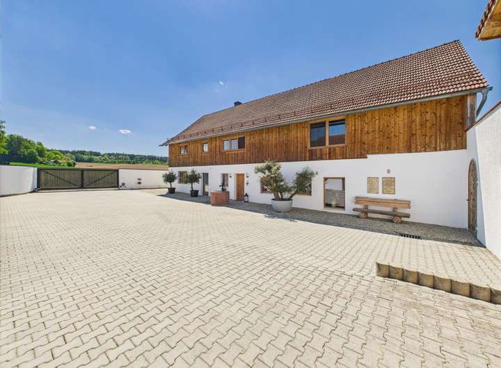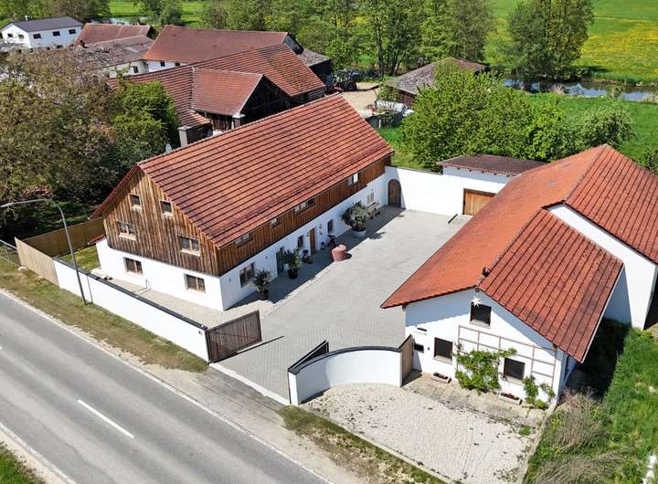 Das Anwesen selbst liegt absolut ruhig und dennoch gut angebunden. Die nächste Stadt mit allen Einrichtungen des täglichen Bedarfs, Schulen, Ärzten und Einkaufsmöglichkeiten ist nur wenige Autominuten entfernt. Gleichzeitig beginnt direkt vor der Haustür die Natur: Spaziergänge entlang der Vils, Ausritte über weite Felder, Fahrradtouren oder einfach das Innehalten unter alten Bäumen – hier spürt man, wie wertvoll Einfachheit sein kann.