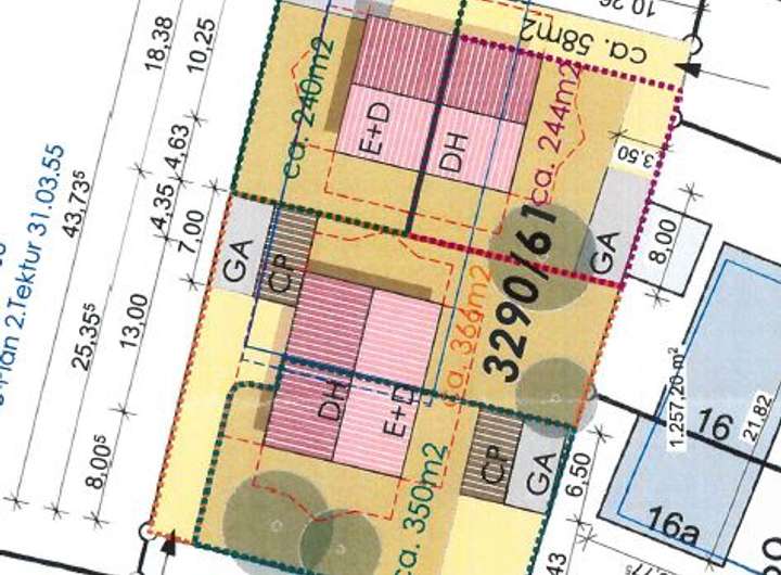 Eine Bauvoranfrage wurde bereits eingereicht. Diese beinhaltet die Planung eines Doppelhauses im westlichen Bereich des Grundstücks sowie eines Einfamilienhauses oder alternativ zwei Doppelhäuser.