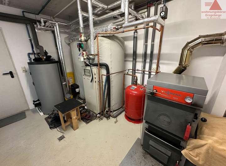 Im Kellergeschoss befinden sich die Garage, ein Freizeitraum, der Hauswirtschaftsraum sowie der Heizungsraum. Hier wurde 2018 eine Erdgas-Brennwert-Therme der Firma Buderus installiert, die zusammen mit neuen Heizkörpern für eine effiziente Beheizung sorgt. Zusätzlich ist ein Festbrennstoffkessel vorhanden. Alle Räume sind mit einer Fußbodenheizung ausgestattet.