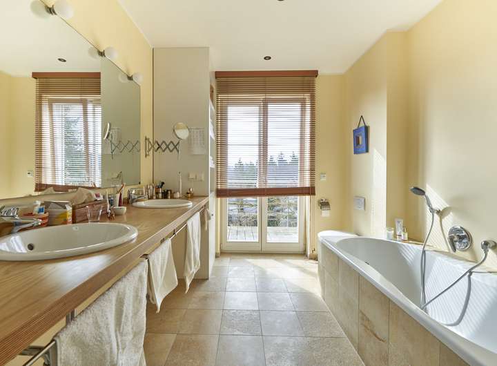 Der Mittelpunkt des Obergeschosses wird von einem einladenden Flur mit einer lichtdurchfluteten Lichtkuppel geprägt. Der quadratische Grundriss sorgt dafür, dass jedes der vier Zimmer Licht von zwei Seiten erhält, die für eine freundliche Atmosphäre sorgen. Hier haben die Kinder ausreichend Platz, um unbeschwert zu spielen und gemütliche Stunden zu verbringen. Das großzügige Raumangebot mit bis in den Giebel geöffnete Decken schafft eine Umgebung, in der sich alle rundum wohlfühlen können. Den Eltern steht neben dem Schlafzimmer eine Ankleide zur Verfügung. Es gibt zwei Bäder auf der Etage.