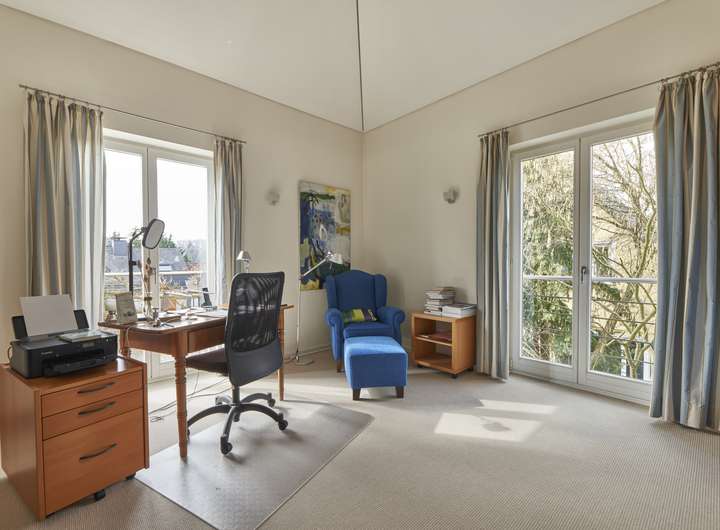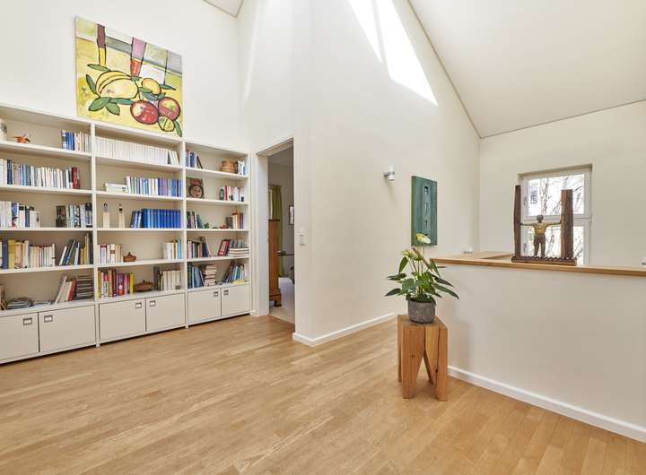 Das Wohnambiente ist modern und offen gestaltet, mit einer hochwertigen Bulthaup-/Gaggenau-Küche, die je nach Bedarf durch eine praktische Schiebetür abgetrennt werden kann. Das gesamte Raumkonzept schafft eine freundliche und einladende Atmosphäre, die der Familie viel Raum für gemeinsame Stunden bietet.