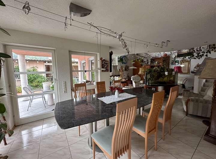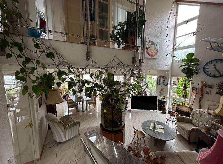 o Lichtdurchflutetes Wohnzimmer mit offener Galerie, großen Fensterfronten und gefliestem Freisitz.