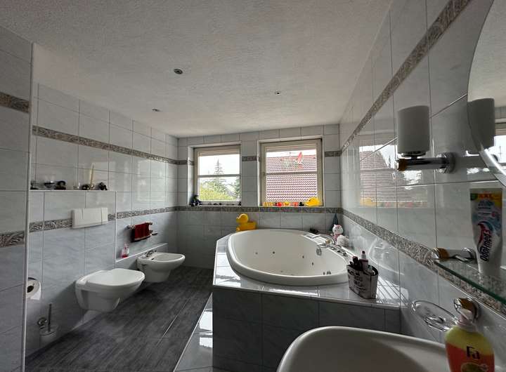 o Luxuriöses Wohnbad: Whirlpool-Badewanne mit Beleuchtung, Dornbracht-Armaturen (teilvergoldet), WC, Bidet und Handtuchhalter.