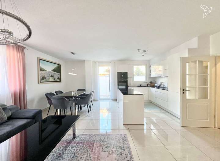 Jede der drei Wohnungen ist mit hochwertigem Parkett- und Fliesenboden sowie eleganten Marmorakzenten versehen. Die dreifach-verglasten Fenster und die elektrischen Rollläden sorgen für hervorragende Isolierung und tragen zur hohen Energieeffizienz des Hauses bei. In Kombination mit der Fußbodenheizung, die in allen Räumen verlegt ist, genießen die Bewohner stets ein angenehmes Raumklima.