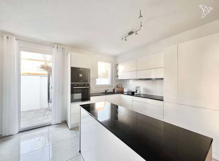 Die moderne Einbauküche mit hochwertigen Geräten macht das Kochen zum Vergnügen. Alle drei Tageslicht-Badezimmer bieten Platz und Komfort, während zwei zusätzliche Gäste-WCs den Alltag erleichtern. Zudem gibt es in den Wohnungen praktische Waschmaschinenanschlüsse.
