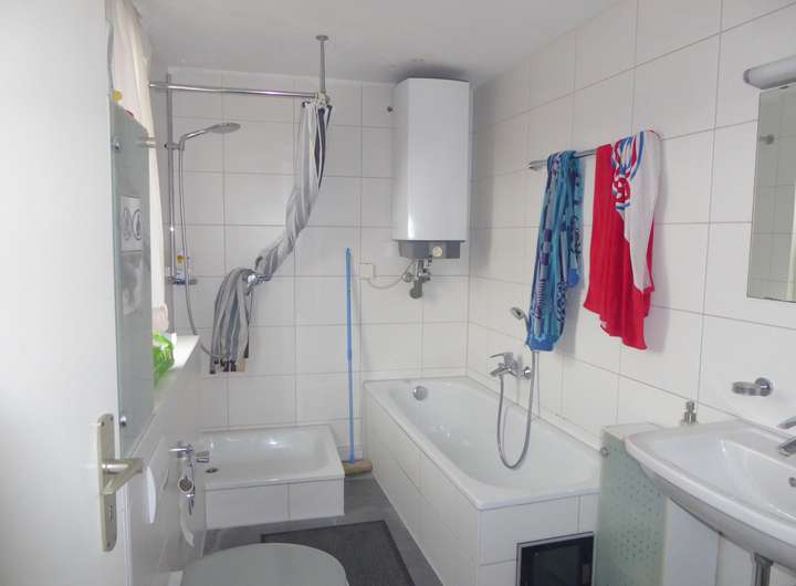- gemeinsames Badezimmer mit Badewanne, Dusche, Waschbecken und WC