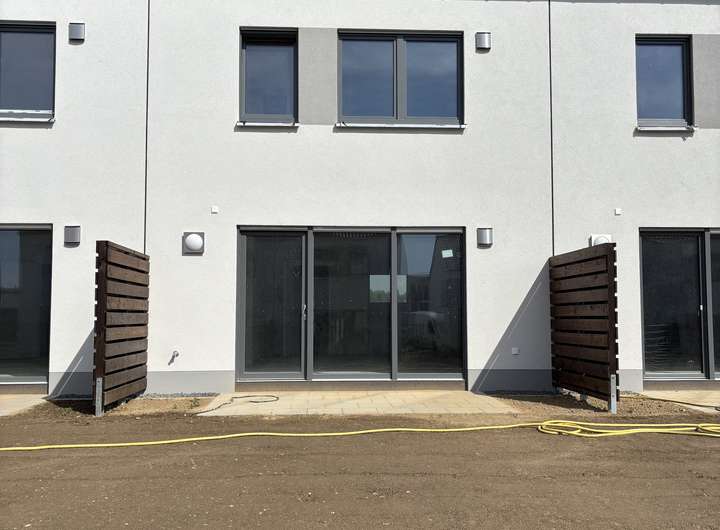 Die Gestaltung der Wärmedämmputz-Fassade haben wir nachhaltig entwickelt. Diese behält ihre Wertigkeit über viele Jahre. Die abwechslungsreiche Fassadengestaltung fügt sich stets harmonisch in das jeweilige Wohnumfeld ein. Großflächige Fenster lassen viel Licht in den Innenbereich. Den Hauseingang haben wir mit einem praktischen Vordach ausgestattet. Briefkasten und Klingelanlage sind aus Edelstahl und die Außenbeleuchtung ist darauf abgestimmt. Für den schnellen Start in die Gartensaison ist der Terrassenbelag bereits verlegt und eine Sichtschutzwand zum Nachbarn schafft die nötige Privatsphäre.