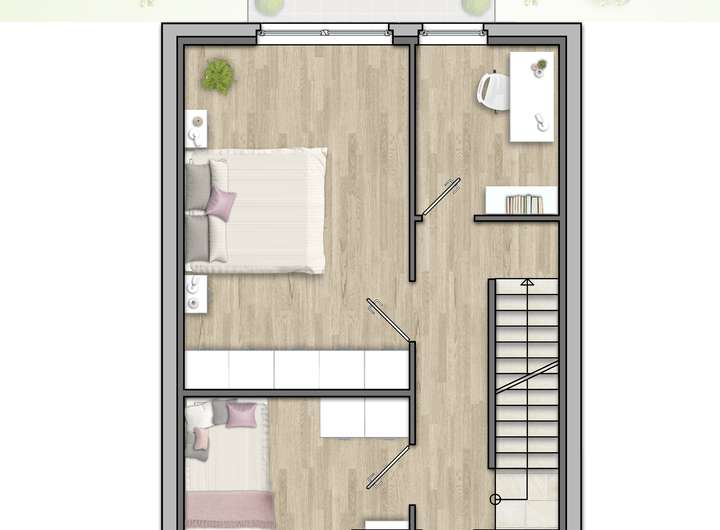 Auch hier sorgen große Fenster in den Räumen für eine helle und freundliche Atmosphäre. Zwei große Zimmer können beispielsweise als Kinder-, Hobby- oder Elternschlafzimmer genutzt werden. Auf Wunsch entsteht durch eine Trennwand ein weiterer Raum, der als Gäste- und Arbeitszimmer oder als begehbarer Kleiderschrank genutzt werden kann. Das Bad mit Fenster bietet ausreichend Platz für eine Dusche und eine Badewanne.