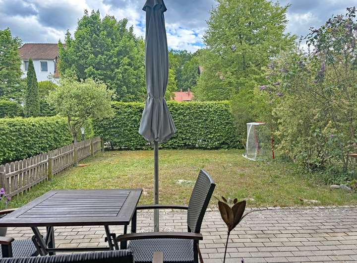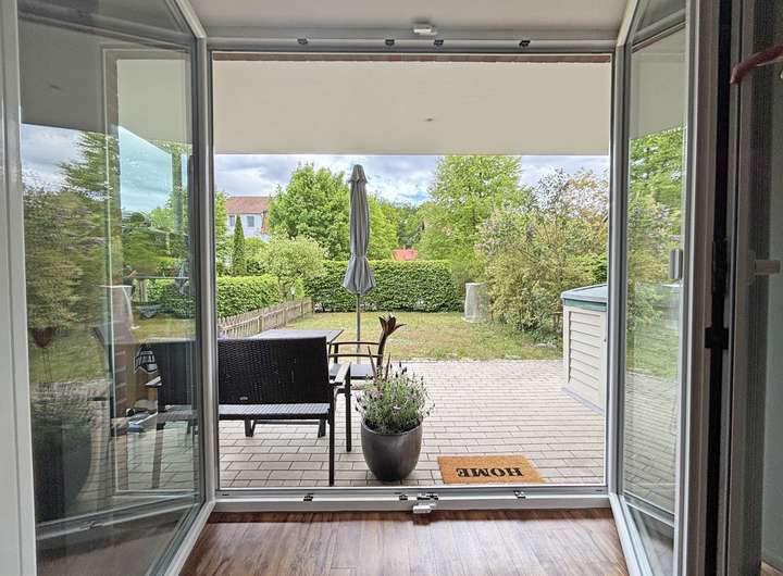 Der lichterfüllte Wohn- und Essbereich überzeugt mit einer modernen, offenen Küche und bietet direkten Zugang zur ca. 12 m² großen Südterrasse, die zum Verweilen im eigenen Garten einlädt.