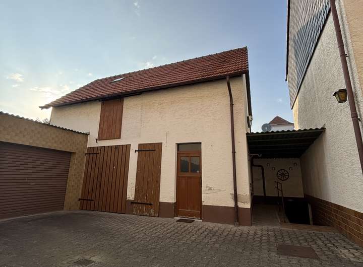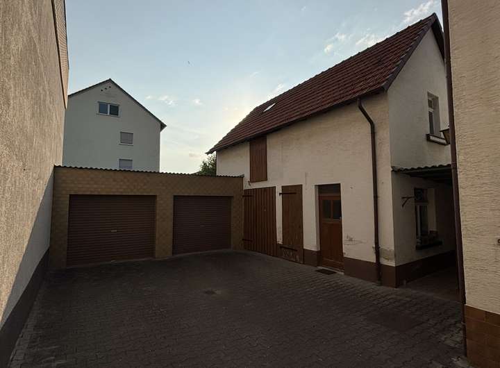 Über den großen Hofbereich gelangt man zu den beiden Einzel-Garagen sowie dem großen Schuppen, hinter dem sich der kleine Gartenbereich befindet, welcher sich durch Abriss des Schuppens entsprechend vergrößern ließe.