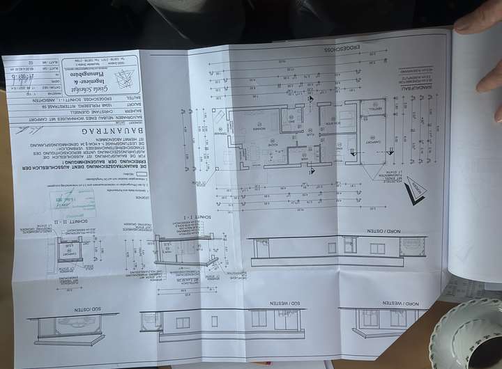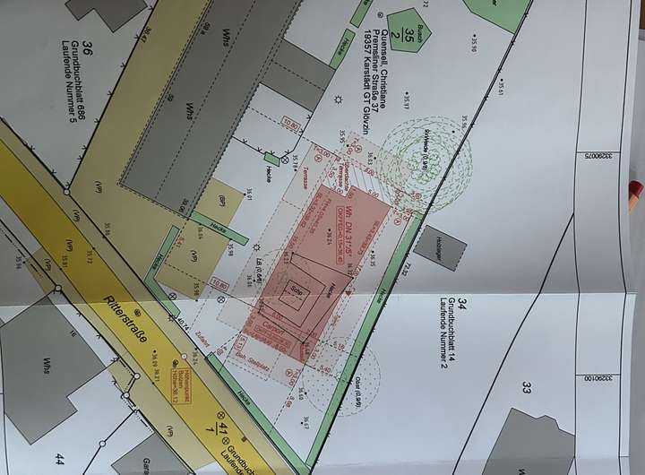 Baugenehmigung, statische Berechnung und Genehmigungsplanung für einen Bungalow liegt vor. Aber größere Bebauung - Bauvoranfrage war positiv - auch möglich. Grast. Muss noch vermessen werden.