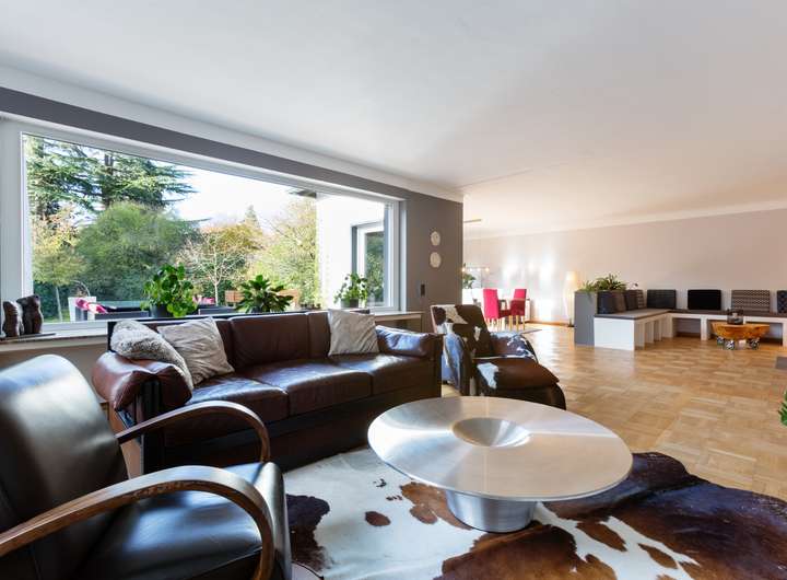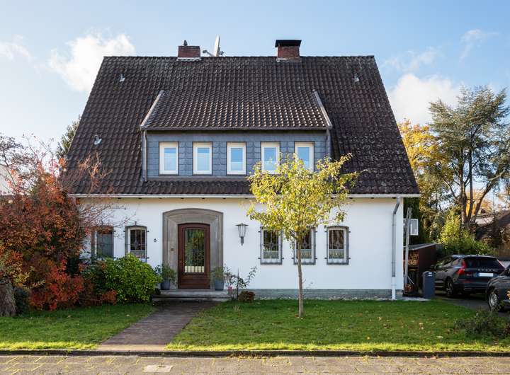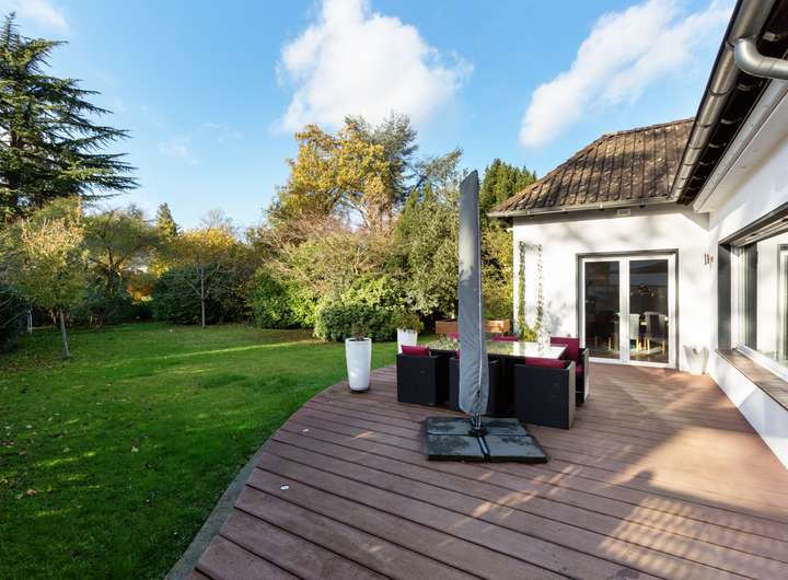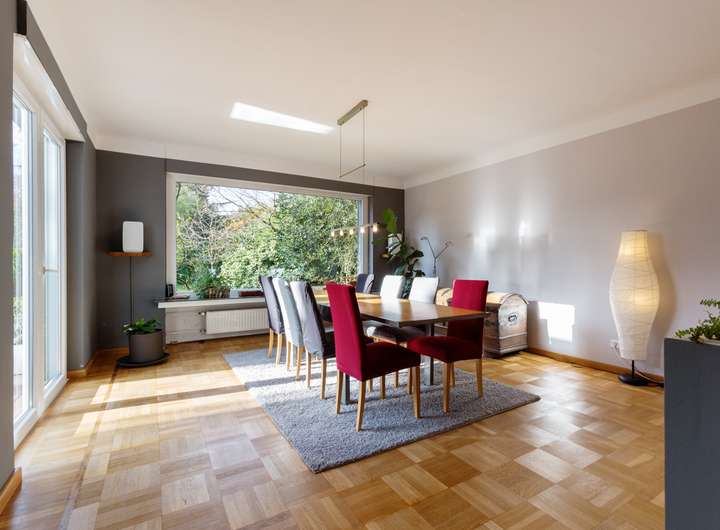 Baujahr: 1955 (seit 2009 fortlaufende Sanierung unter Erhaltung der baujahrestypischen Stilelemente); Grundstücksgröße: 1.150qm; alt eingewachsener Garten mit eigenem Brunnen und Bewässerungssystem; Wohnfläche: 270qm; voll unterkellert (115qm) mit Sportraum; 5 Schlafzimmer; Elternschlafzimmer mit begehbarer Ankleide und Einbauschränken; 2 moderne Bäder; 70qm großes Wohn-/Esszimmer mit Kaminecke, Original Eichenparkett und 3 großen, in den Garten ausgerichteten Panoramafenstern; Büro/Bibliothek mit Zugang zu Terrasse und Garten, weisse Bulthaup Küche mit Eichenparkett;
