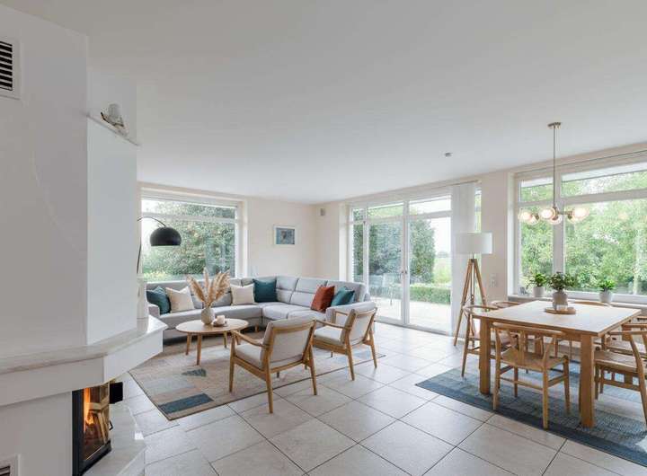 Das Herzstück des Haupthauses bilden der großzügige Wohn- und Essbereich mit Kamin sowie die Küche.