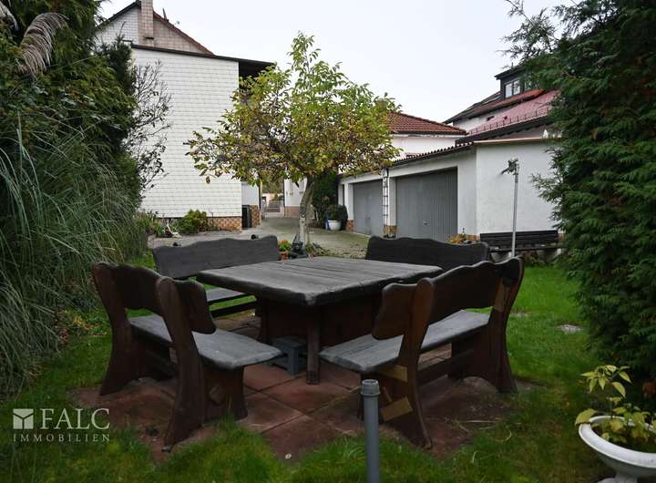 Das 709 m² große Grundstück verfügt über ca. 250 m² Gartenfläche, die zum Entspannen einlädt. Zur Immobilie gehören zudem zwei Doppelgaragen und zwei ausgewiesene Außenstellplätze.