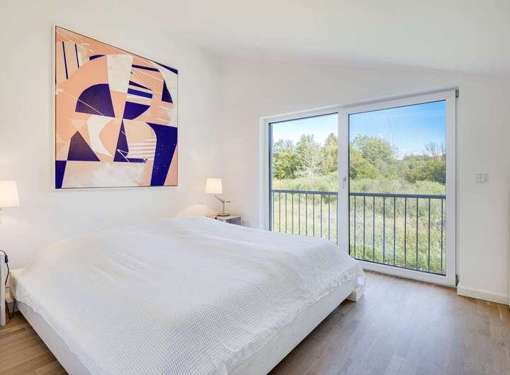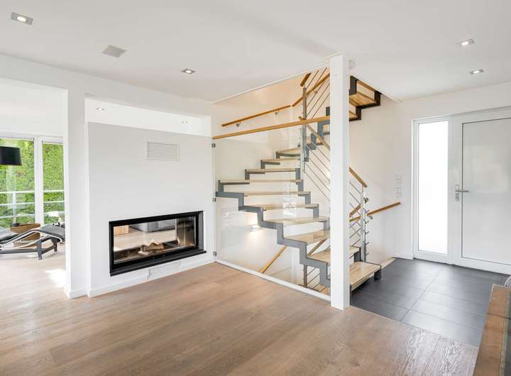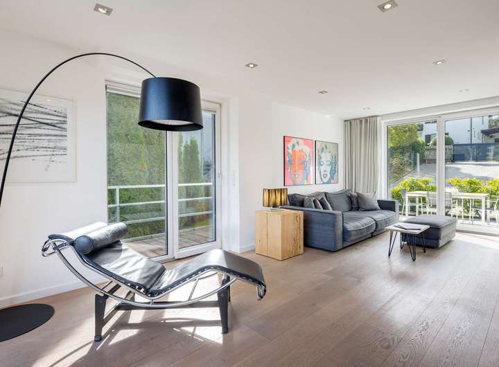 - Massives Eichen-Dielenparkett, hell gekalkt, im Erdgeschoss; Eichen-Stabparkett im Obergeschoss (ausgenommen Eingangsbereich und Bäder) sowie Teilen des Untergeschosses; weiße Sockelleisten