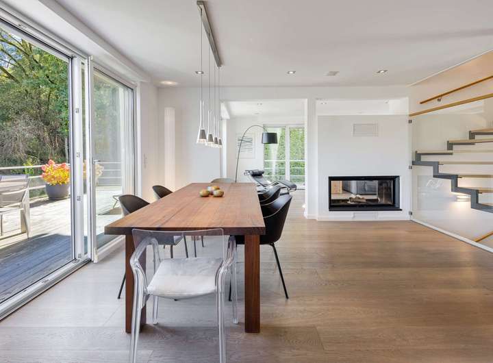 - Raumgliedernder XXL-Panoramakamin (Brunner) im Wohn-/Essbereich