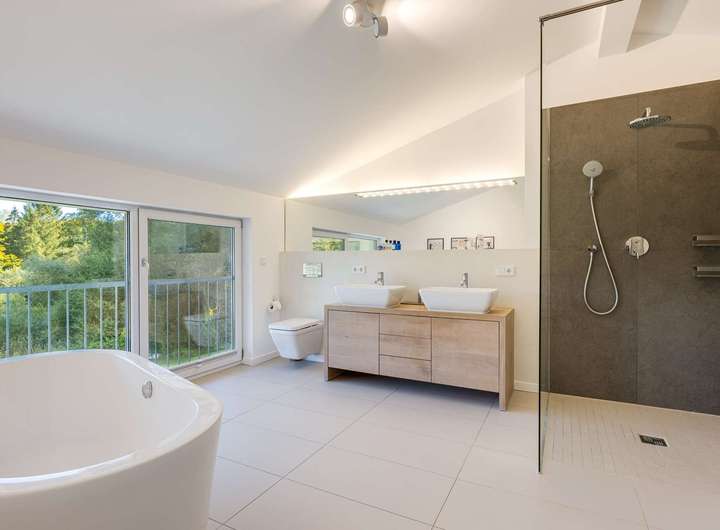 - Geräumiges Tageslicht-Bad (Dachgeschoss), gestaltet mit cremefarbenem Feinstein, ausgestattet mit freistehender Wanne, bodengleicher Rainshower-Dusche, Doppel-Waschtisch samt zwei Aufsatzbecken (Villeroy & Boch) und maßgeschreinertem Unterschrank, beleuchtetem Spiegel, WC und Deckenspots