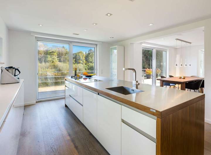- Einbauküche (Allmilmö) mit Holz- bzw. weißen Hochglanz-Fronten, großer Kochinsel mit beidseitigem Stauraum, Edelstahl-Arbeitsfläche, integriertem Spülbecken und Steckdosen-Turm, ausgestattet mit breitem Induktionskochfeld (Neff), ausfahrbarem Dunstabzug (Gutmann), Backofen (Gaggenau), Geschirrspüler (Siemens, neu in 2024), XXL-Kühlschrank (Liebherr, neu in 2024) und separatem Tiefkühler (Neff)