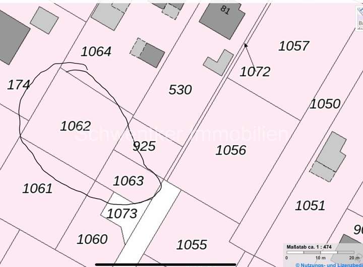 Das Grundstück hat eine Gesamtgröße von 778 qm und wird geteilt. Teilungs- und Vermessungskosten gehen zu Lasten des Käufers.