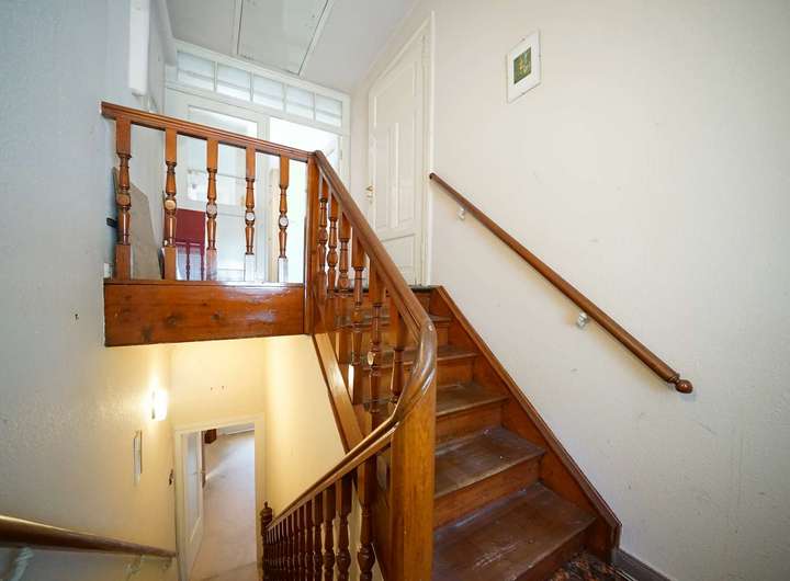 Im Erd- und Dachgeschoss sind Feuchtigkeitsschäden und z.T. großflächig Schimmel an der Wand.
