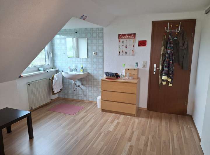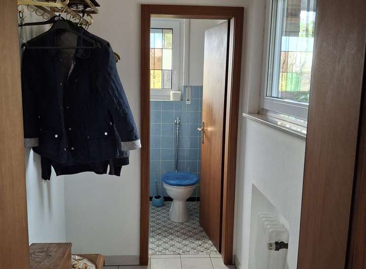 Zweiter Flur mit WC und Waschtisch nebenan. Dieses könnte man zusammenfügen um ein großes Bad zu kreieren. Dahinter ist ein Speicher.
