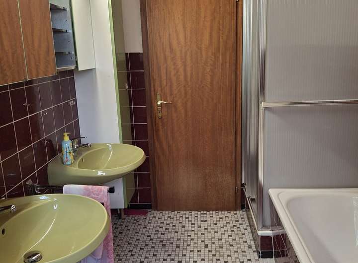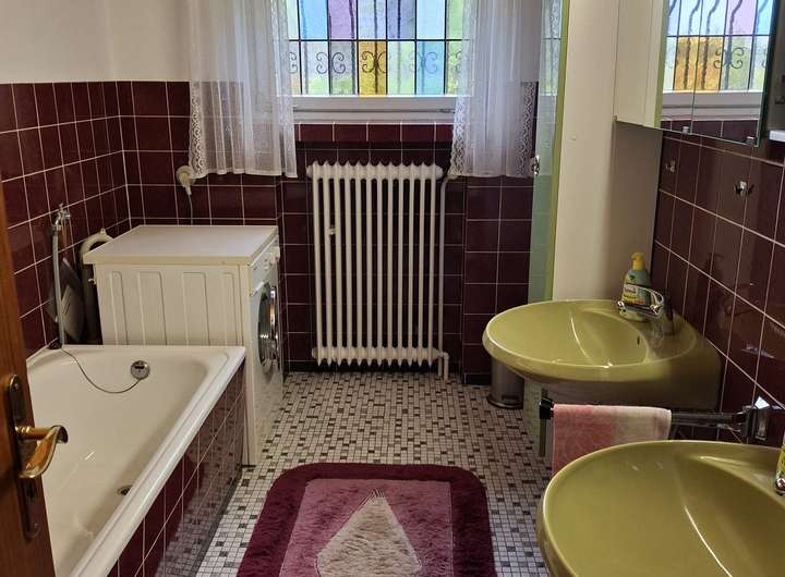 Badezimmer mit Badewanne, Dusche, doppelter Waschtisch (+Möbel).